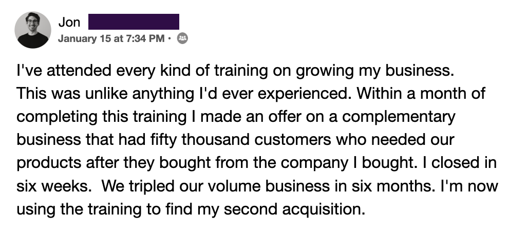 I just finished the program. I now have my action plan to acquire two small direct-to-consumer companies that buy from me. I'm excited to get started on a vertical tuck-in of these two businesses.  This will increase my cash flow, and multiply the value of my total business picture.