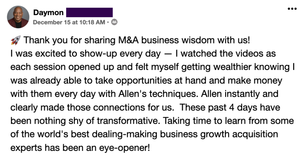 “Allen, just for fun... as soon as I left your final day four session, I immediately called one of my suppliers — all of the business I give to him represents 40% of his sales. I wanted to crush it, so I took your advice, Allen and made him a no-money-out-of-pocket buy-out offer for half of his business and he took it! That was three months ago. Now, we're working well together and I have tripled his business simply by referring competitors to buy from his business. AMAZING! Thank you so much Allen